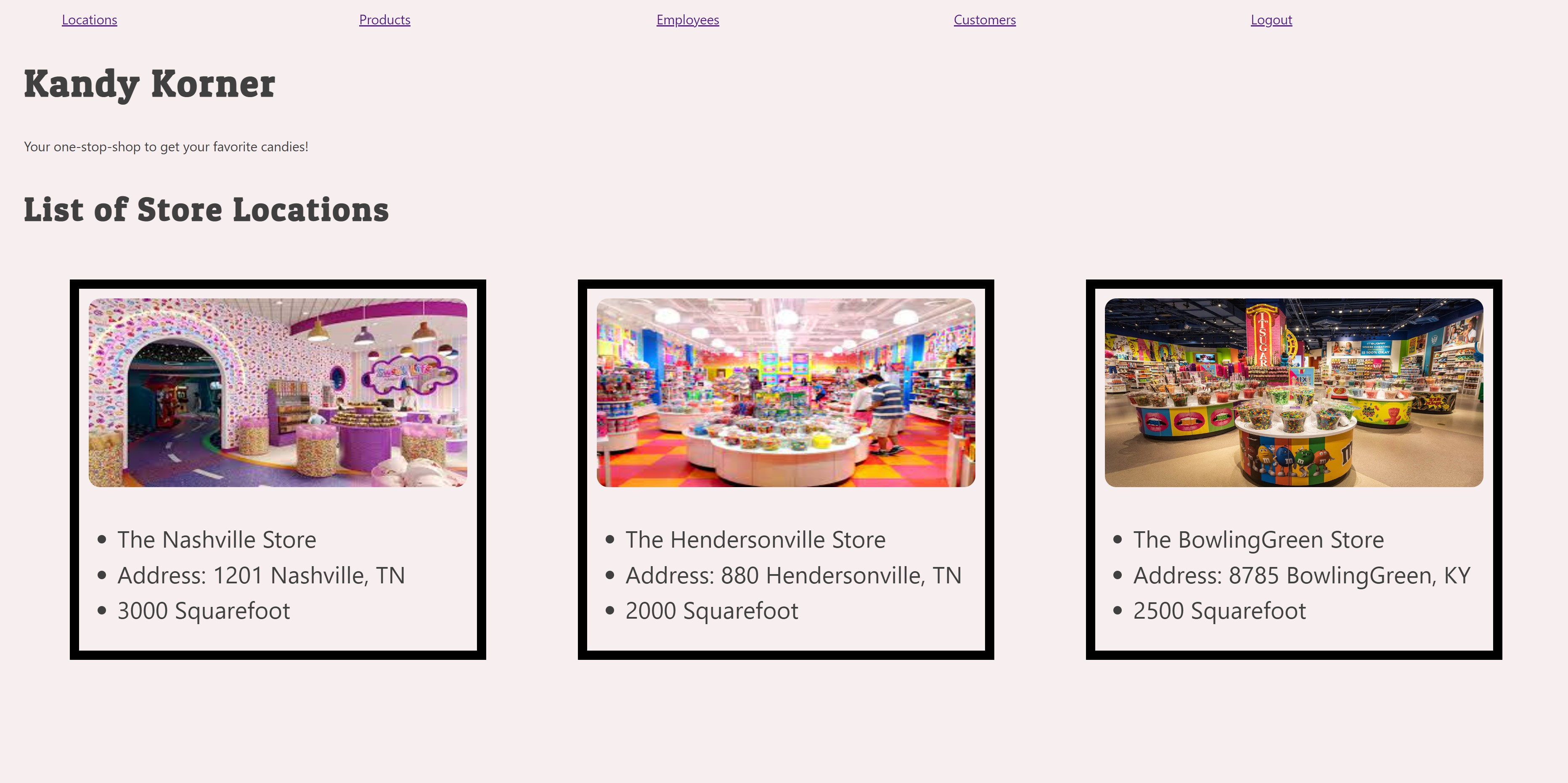 Kandy Korner is a website created using React and simple CSS. This app allows customers to login, filter through and purchase available products, and keep track of their orders. This app also allows employees to login, filter through and add a product, inspect and add or delete from a list of employees, and inspect customers information and update customers loyalty numbers.