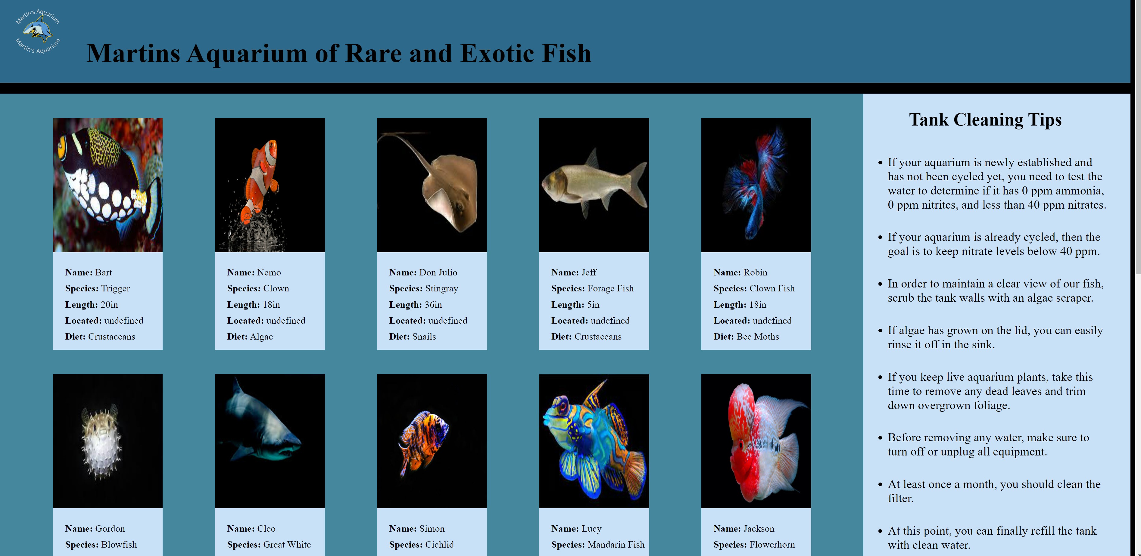 Martin's Aquarium is a minimal webpage displaying basic CSS and HTML. The purpose of this webpage was to display rare and exotic fish located at martins aquarium. On the same page, I also included helpful travel tips, countries visited, and tank cleaning tips located in an aside. This project was completed during my first month at Nashville Software School.