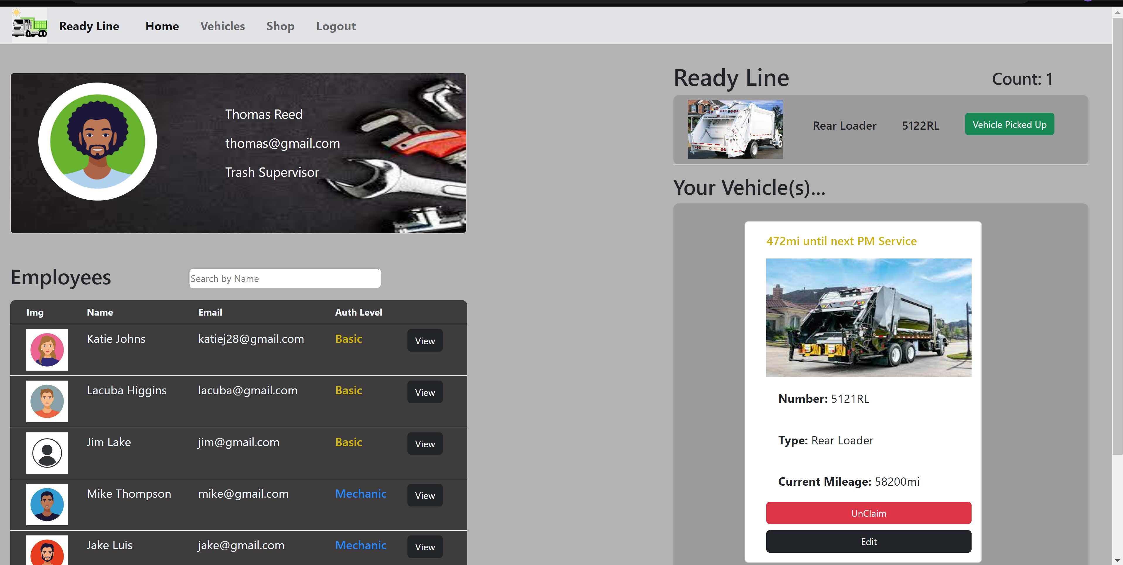 Ready Line is a multi-functioning application that focuses on allowing a company to keep a close track of their vehicles by seeing reports made by their drivers and mechanics. A driver can claim a vehicle, update the current mileage, and create a report when turning a vehicle into the shop. Mechanics are responsible for adding notes to a report when needed and updating them until completion.